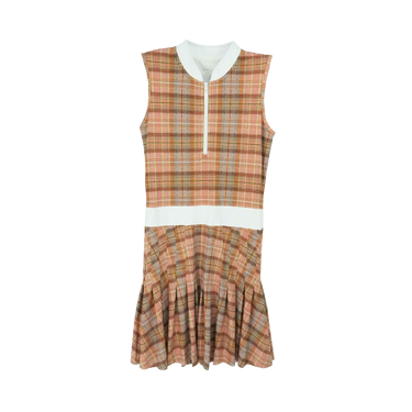 - Sleeveless mandarin collared golf dress with pleated skirt, zipper neck closure and side pockets, machine washable.