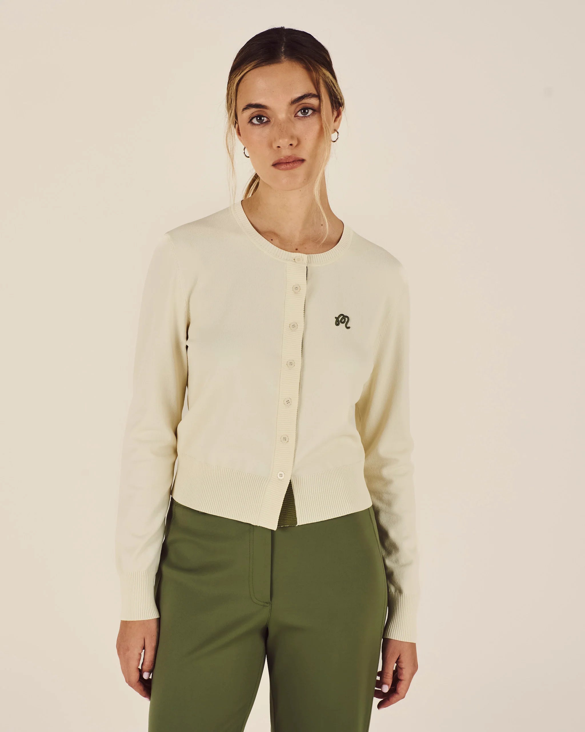 - Embroidered M script logo on left chest